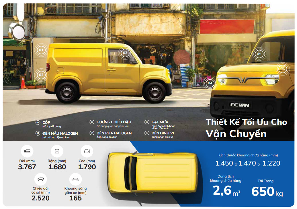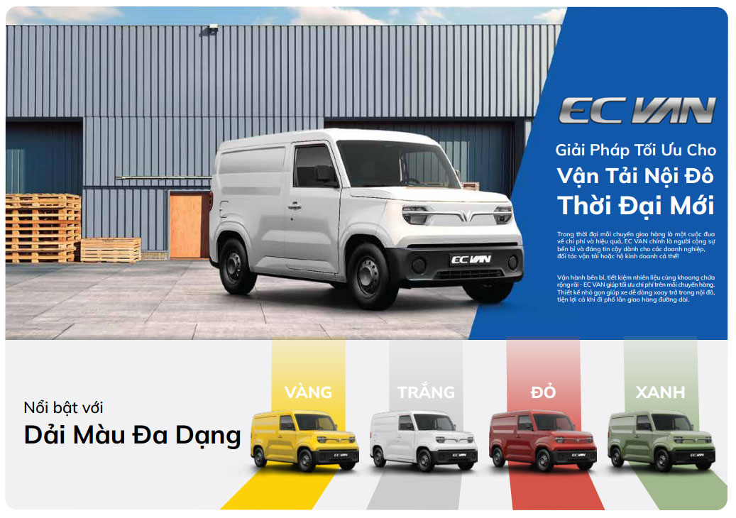 EC Van tiên phong mang đến giải pháp vận chuyển thương mại đột phá, nổi bật với khả năng vận hành linh hoạt, êm ái và tiết kiệm chi phí. Sở hữu thiết kế hiện đại, tiện dụng cùng bảng màu ngoại thất với 4 lựa chọn nổi bật Xanh – Vàng – Trắng – Đỏ, EC Van không chỉ là phương tiện di chuyển mà còn là đối tác tin cậy, phương tiện sinh kế phù hợp cho kinh tế hộ gia đình, doanh nghiệp.