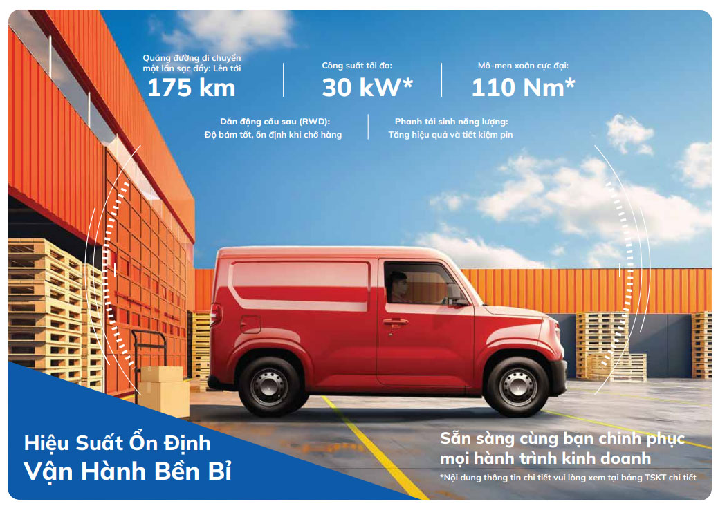 Quãng đường di chuyển lên tới 175 km cho mỗi lần sạc đầy (theo tiêu chuẩn NEDC), phù hợp với chu kỳ vận hành giao hàng trong ngày.